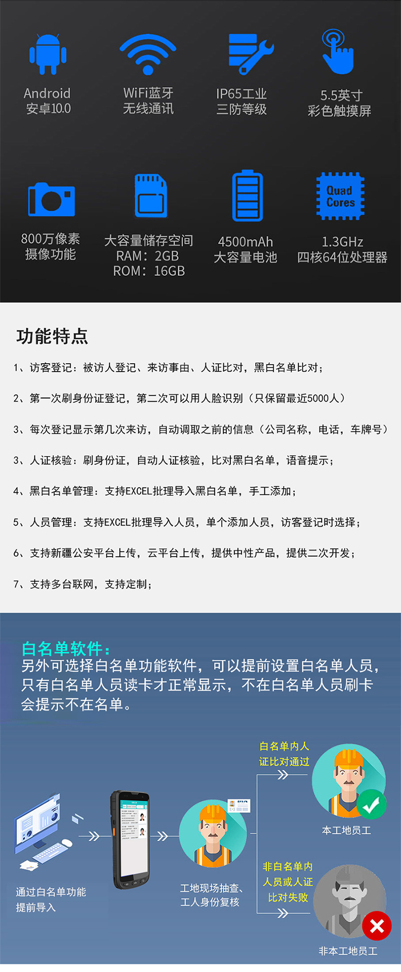 產(chǎn)品支持身份證識別,人證對比,黑名單比對,來訪登記,支持4g,云平臺上傳,提供二次開發(fā),支持訂制