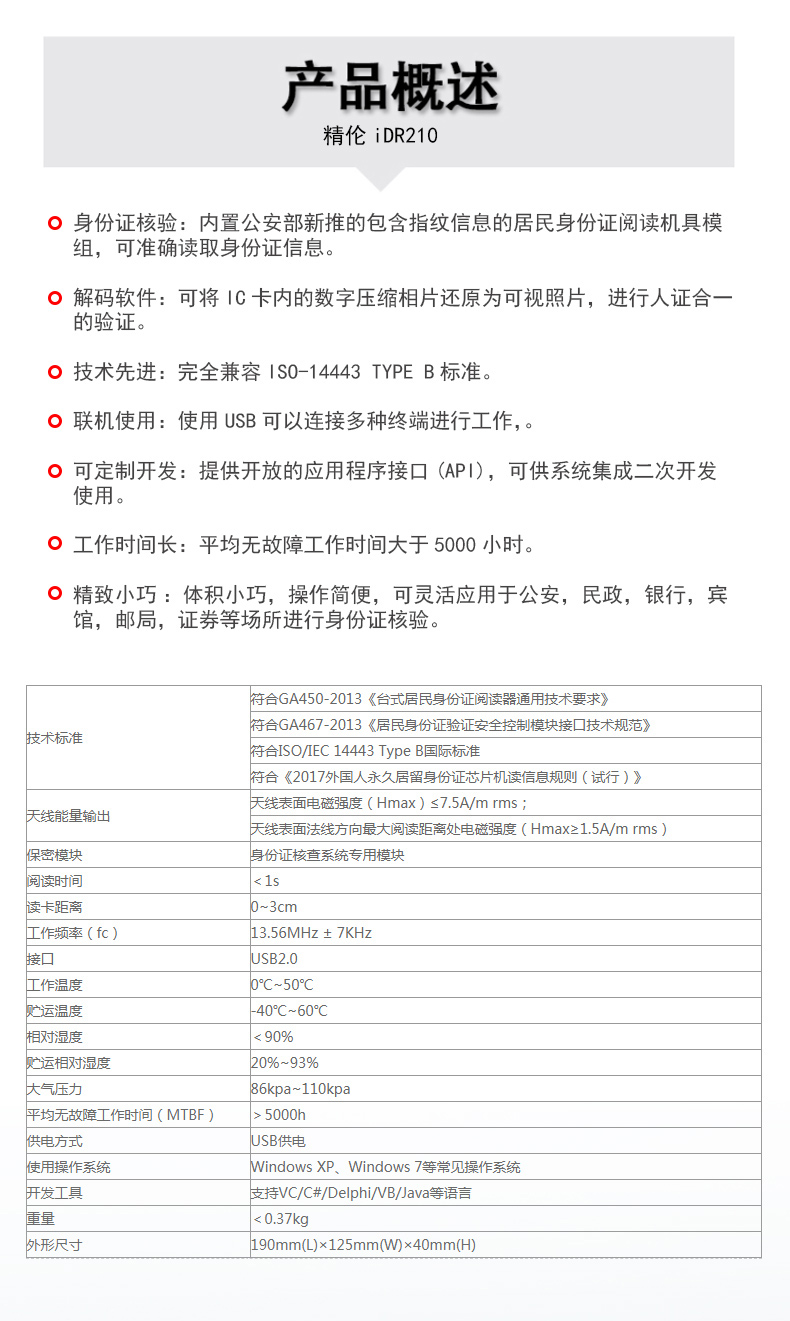 (*由于產(chǎn)品升級(jí)或其他原因,精倫IDR210身份證閱讀器產(chǎn)品實(shí)際參數(shù)有可能變更,以實(shí)際產(chǎn)品為準(zhǔn)。本文中的所有陳述、信息和建議也不構(gòu)成任何明示或暗示的擔(dān)保)